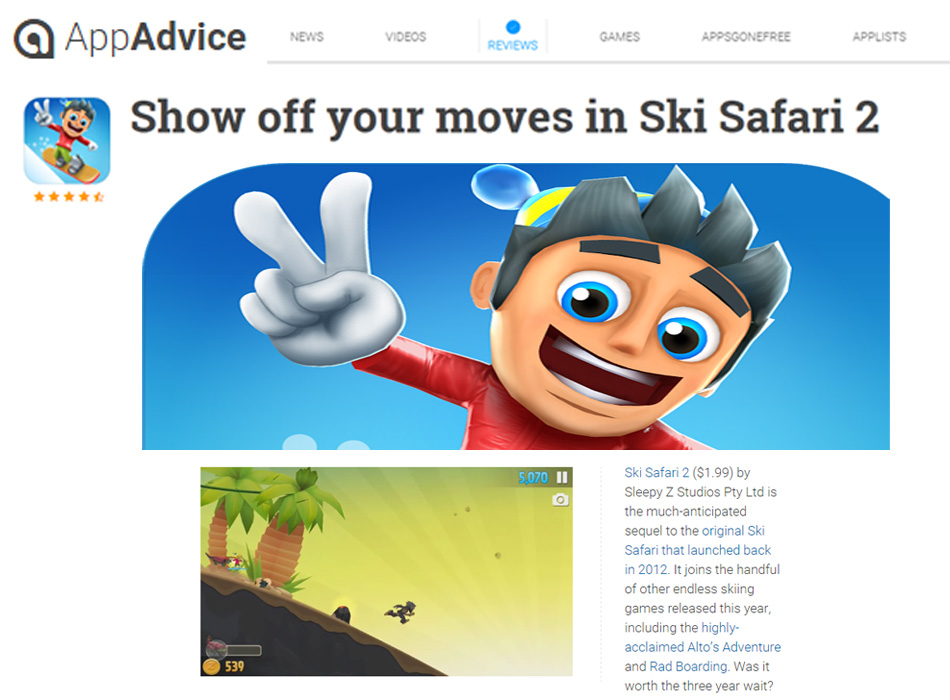 Christine Chan from App Advice recently reviewed Sleepy Z Studios’ Ski Safari 2, highly recommending it to fans of the original and to all fans of endless runners. She praises the game’s revamped visuals, smooth animations, delightful music and intuitive one-touch controls.