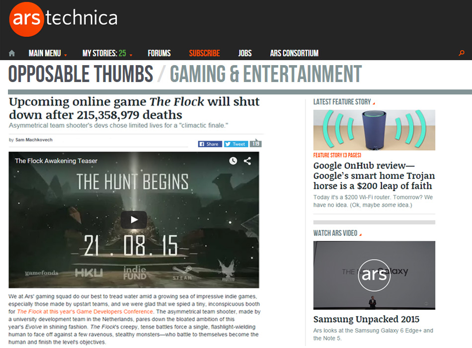 To read the full article, please visit: http://arstechnica.com/gaming/2015/08/upcoming-online-game-the-flock-will-shut-down-after-215358979-deaths/