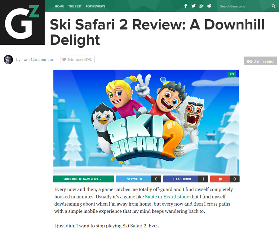 In his review of Ski Safari 2, Tom Christiansen praises the game, calling it a “Downhill Delight,” as well as saying that the game is “basically everything you love about traditional mobile gaming distilled into a single title.”