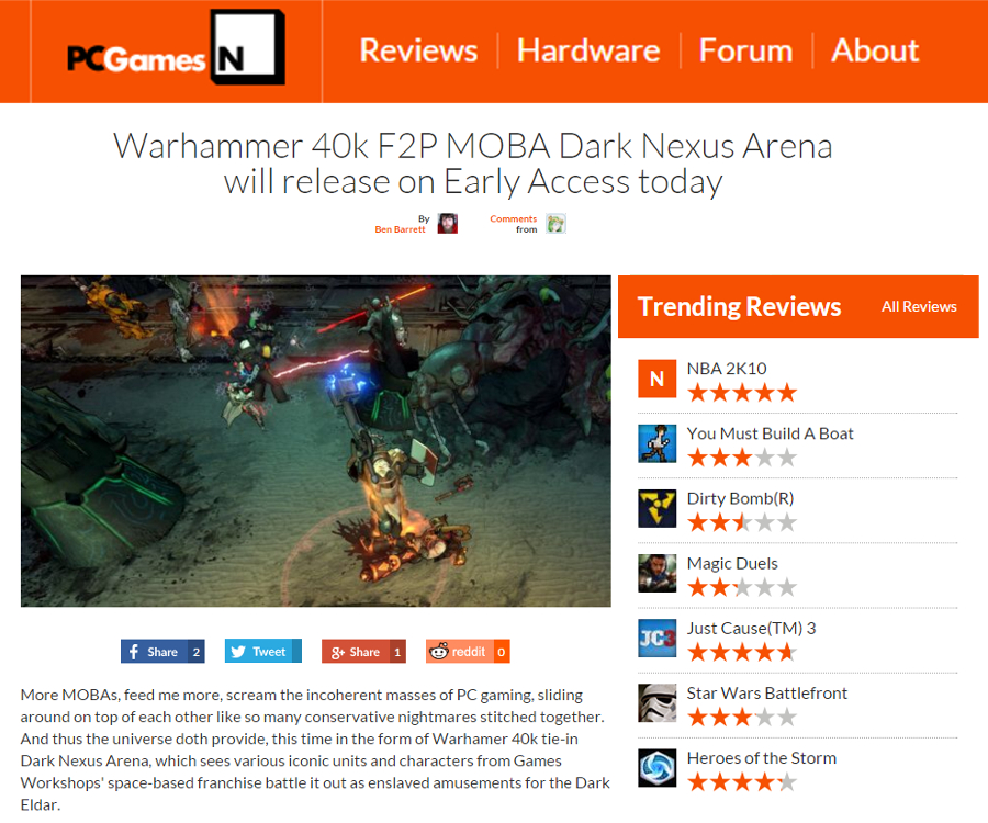 To read the full article, please visit: http://www.pcgamesn.com/warhammer-40k-f2p-moba-dark-nexus-arena-will-release-on-early-access-today