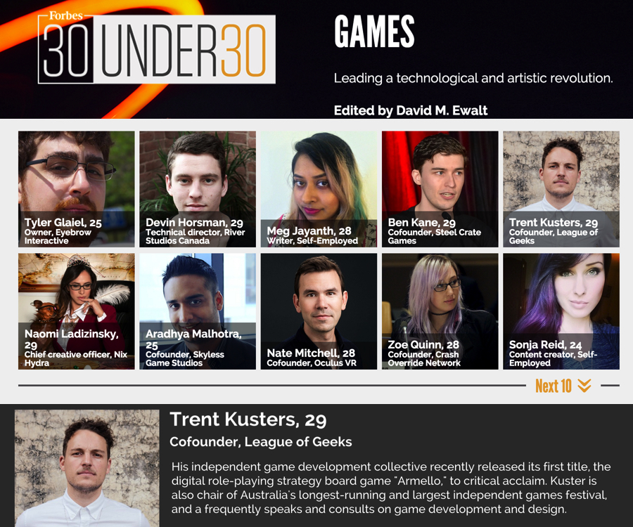 Every year Forbes recognizes 30 successful young entrepreneurs and innovators from 20 different disciplines of business. This year in games Trent Kusters, co-founder of our client League of Geeks, is recognized.