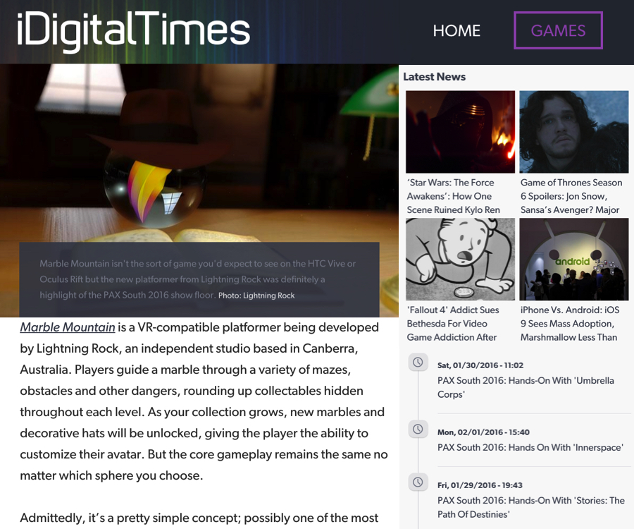 Marble Mountain, the VR-compatible third-person 3D platformer developed by Lightning Rock, was previewed at PAX South 2016 by Scott Craft of iDigtialTimes. Players guide their marble through Indiana Jones styled treacherous environments on an epic journey to the top of the mountain.