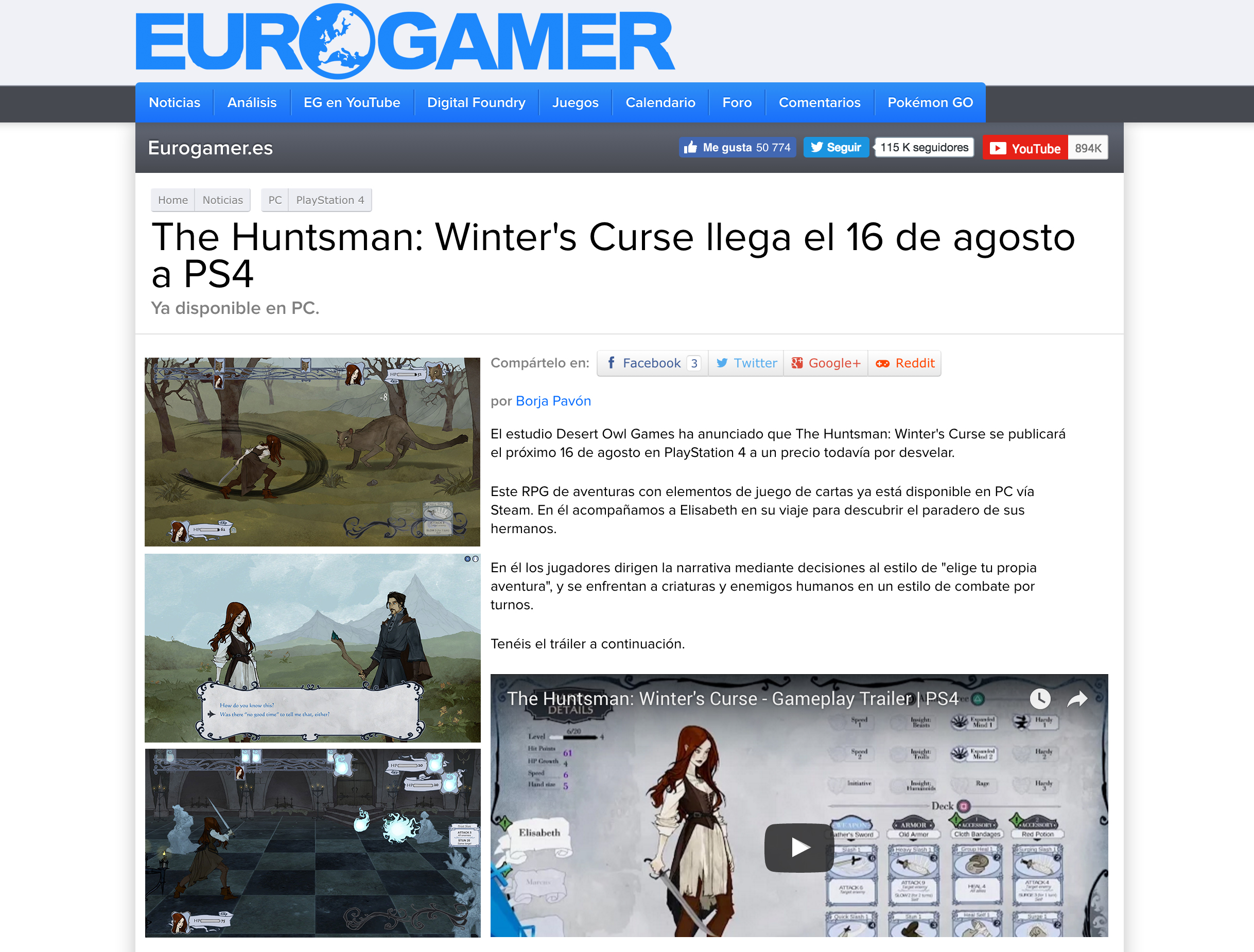 Borja Pavon of Eurogamer Spain shares The Huntsman: Winter’s Curse is coming to PlayStation 4.