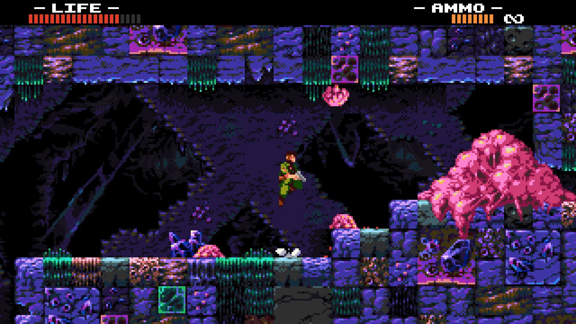That was mostly just going back to the original Metroid and studying what worked about its combat. In run ‘n guns like Contra you can typically fire diagonally and hang far back trying to hit things across the screen, which contrasts with Metroid where the range of the bullets is much smaller, and the player must carefully approach enemies to engage. Adding the reloading mechanic on top adds another layer of preparation for each engagement rather than just spamming the screen with projectiles.